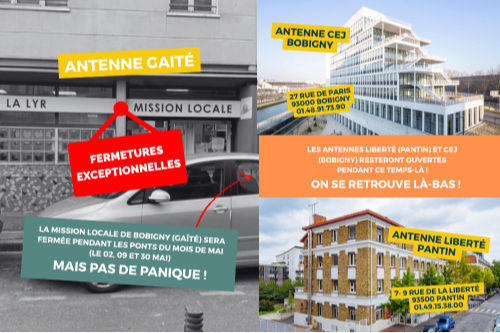 Seul le site de Bobigny Gaité sera fermé sur les ponts du 02 09 et 30 mai : Les antennes de Pantin et Bobigny CEJ restent ouvertes.